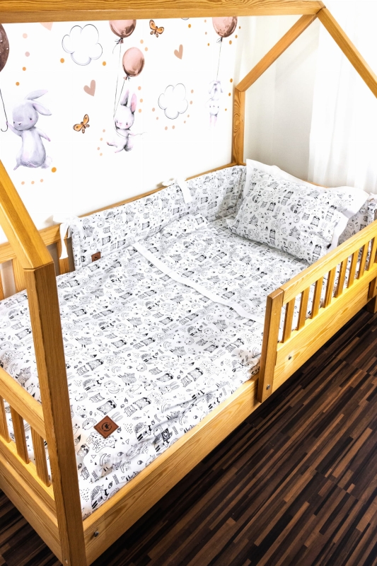 - Pościel do łóżeczka składa się z dwóch elementów, poszewki i kołdry.